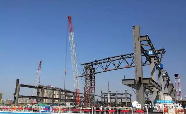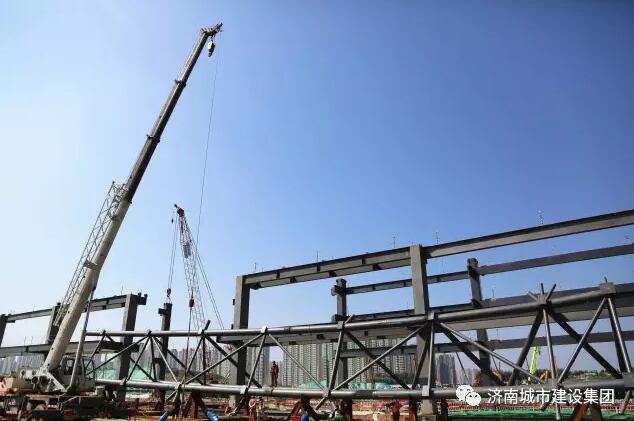 首榀吊裝完成!濟南西部會展中心每根大梁70米長90噸重