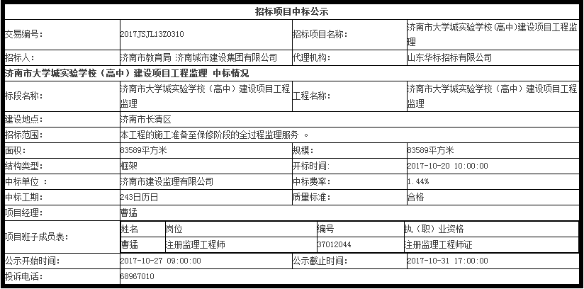 濟南市大學(xué)城實驗學(xué)校(高中)建設(shè)項目工程監(jiān)理中標公示