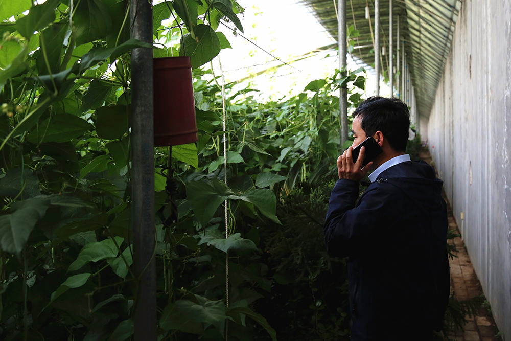 7:30當(dāng)我們到達(dá)陳德國所在的大棚區(qū)時,他已經(jīng)工作了一個小時。“像這種老葉、黃葉要抓緊摘掉了,到了一定年限就只吃飯不干活,影響光合作用。”在蕓豆種植棚,陳德國正在電話指導(dǎo)著種植戶。