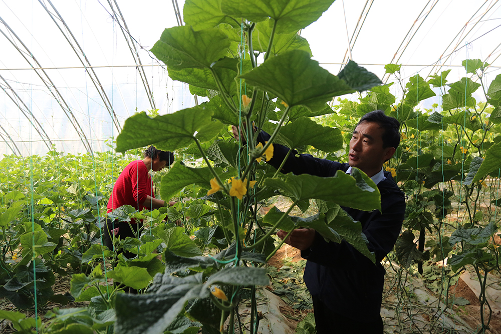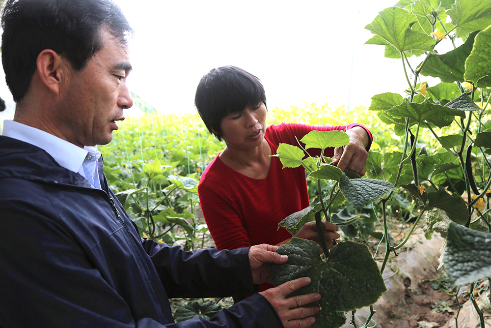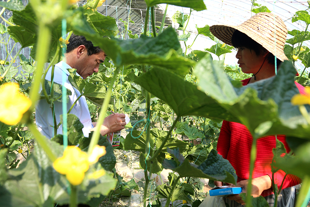 “打藥一定要按時打按量打,提前打了沒效果,拖后了就容易產(chǎn)生殘留,”陳德國仔細(xì)指導(dǎo)著黃瓜種植戶。