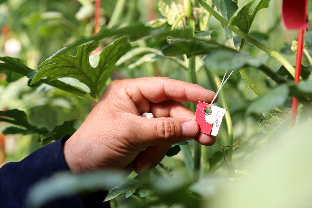 9:15在園區(qū)西瓜種植上,陳德國沒有照搬仁風(fēng)西瓜的“彩繩法”,而是自創(chuàng)“標(biāo)簽作法”,即根據(jù)授粉時間與成熟期給西瓜藤掛上不同號碼的牌子,根據(jù)生長周期判斷是否成熟。
