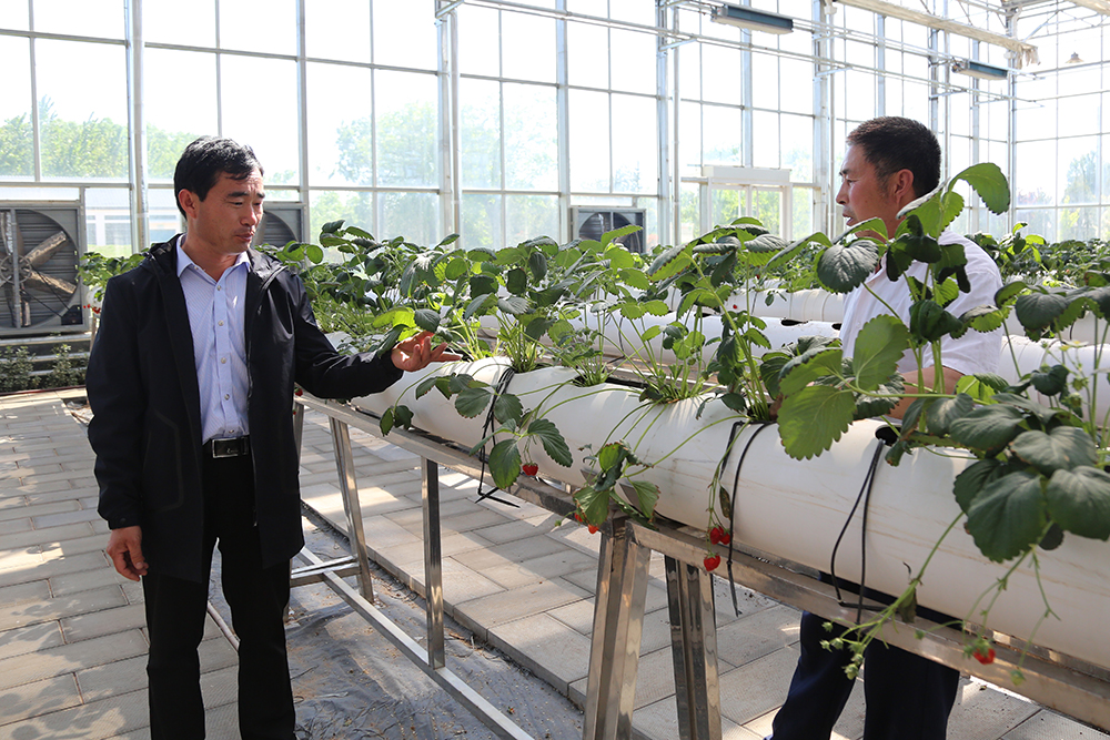 在連棟溫室里,陳德國察看前期做育苗試驗的情況。“草莓在這里第一年的種植效果就很好,原因在于前期我們吸取教訓(xùn),在這些塑料管子下面打孔處理,管內(nèi)放著陶粒和紗窗,給原有設(shè)備增加了透氣性。”陳德國解釋道。