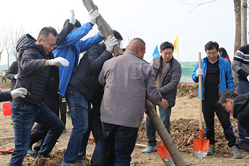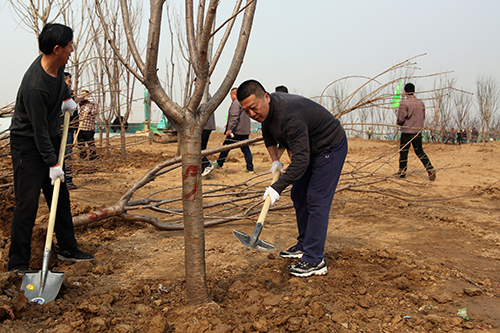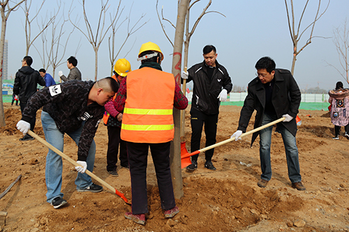 在活動現場,參加植樹的干部職工個個熱情高漲、干勁十足,他們幾個人一組,扶直樹苗、揮鍬培土、踩實壓緊,大家配合得很默契,整個勞動場面繁忙而有序。經過一上午的緊張勞動,一排排整齊的苗木為初春增添了生機。
