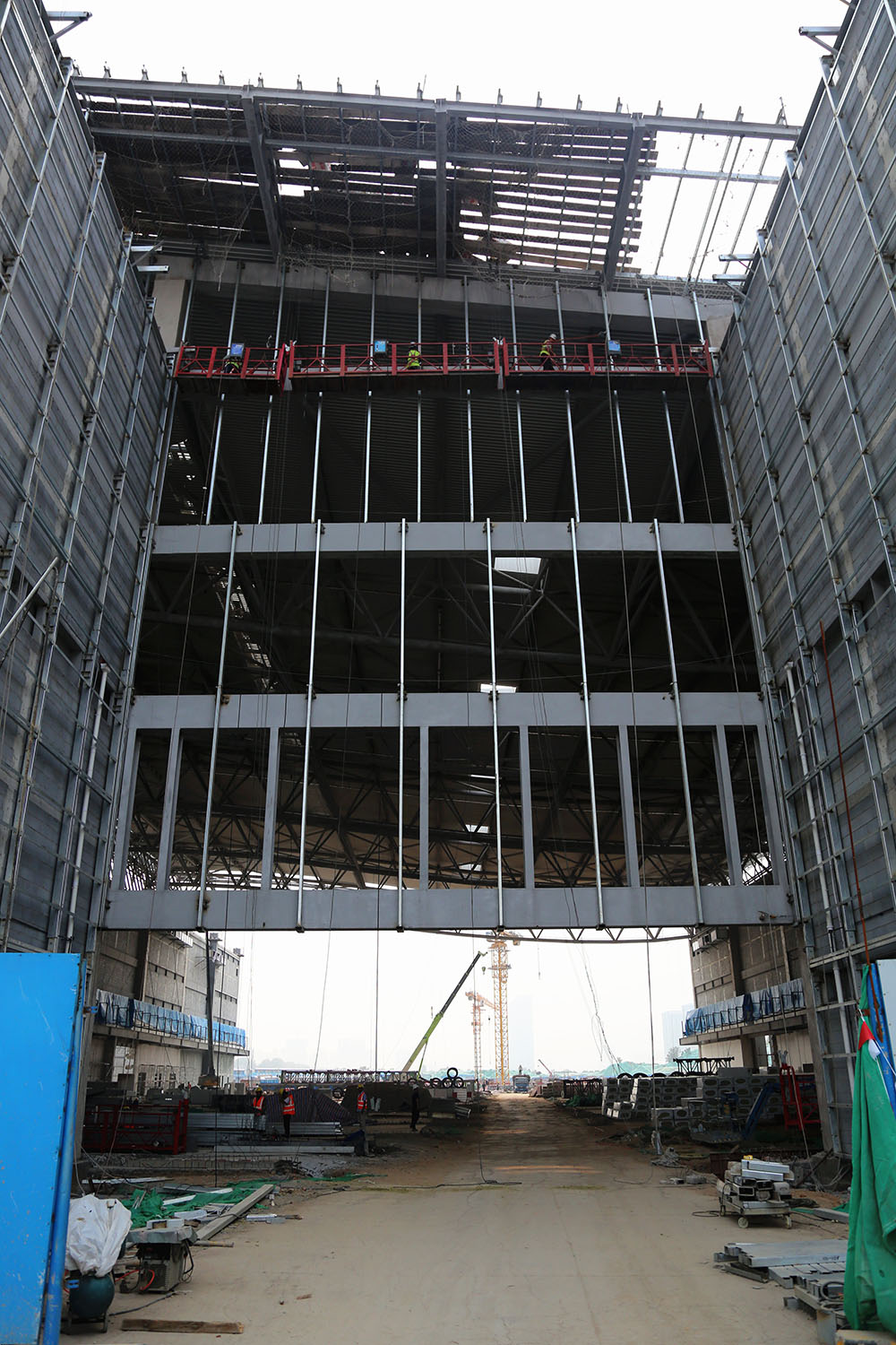 目前,展館區域主體鋼結構進入收尾階段,其中4號館、5號館已完成主體結構驗收,已全面轉入金屬屋面、幕墻外圍護體系及室內裝飾、安裝施工階段;1號館、2號館及3號館主體鋼結構施工正處于收尾階段;整個展館區域計劃6月底主體結構封頂。