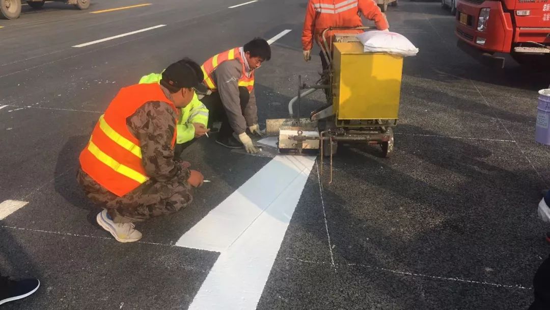 雙組份高亮標線涂料的主要原料是 “甲基丙烯酸甲酯”(英文縮寫MMA),此次路面標線施劃的標線涂料全部采用MMA雙組份,具體施工內容為MMA雙組份標線(刮涂)6100㎡、MMA雙組份標線(甩涂)4300㎡、MMA雙組份標線(噴涂)2200㎡。