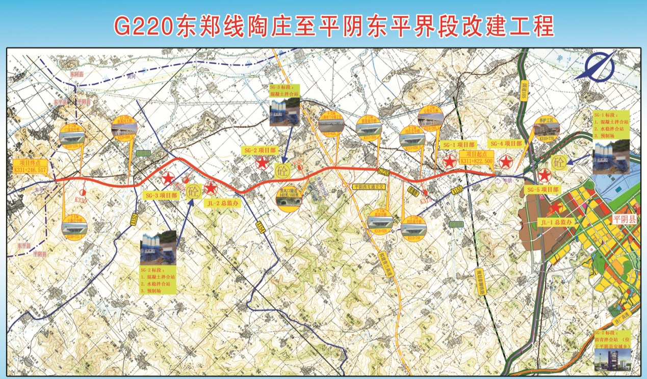 G220東鄭線陶莊至平陰東平界段改建工程項目位于濟南市平陰縣境內,路線全長19.424km,其中利用原路改建段16.635公里,新建段2.789公里。全線設大橋2座、中橋6座、小橋3座、涵洞53道、隧道440米/1座、分離立交1座,新建養護工區1處。全線采用雙向四車道一級公路標準,設計速度80公里/小時,路基寬度一般路段為24.5米;東阿鎮路段路基寬37米,設置非機動車道;隧道進出口分離路基路段路基寬12.25米,批準概算6.54億元,計劃總工期579天。