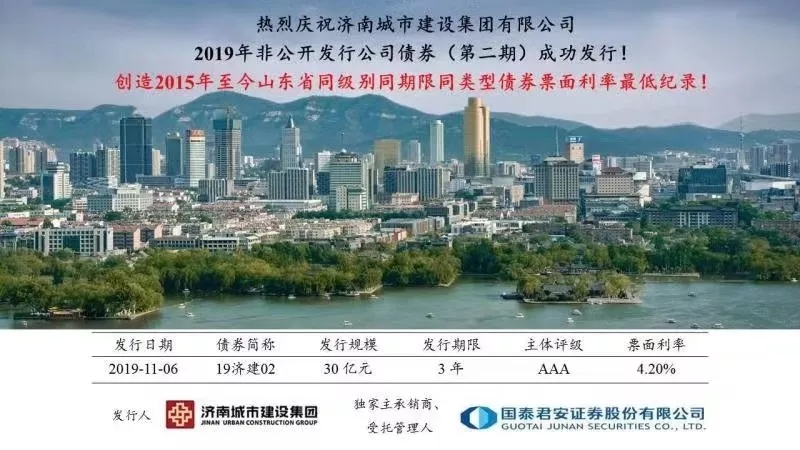 2019年11月6日,濟南城市建設集團非公開發行2019年公司債券(第二期)(“19濟建02”)發行圓滿落地,創造2015年至今山東省同級別同期限同類型債券票面利率最低紀錄。本期債券發行得到了市場的廣泛認可,投資者認購踴躍。19濟建02低利率發行,充分展現了投資者對建設集團領先的行業地位、良好的品牌形象以及穩健的財務政策等方面的肯定。