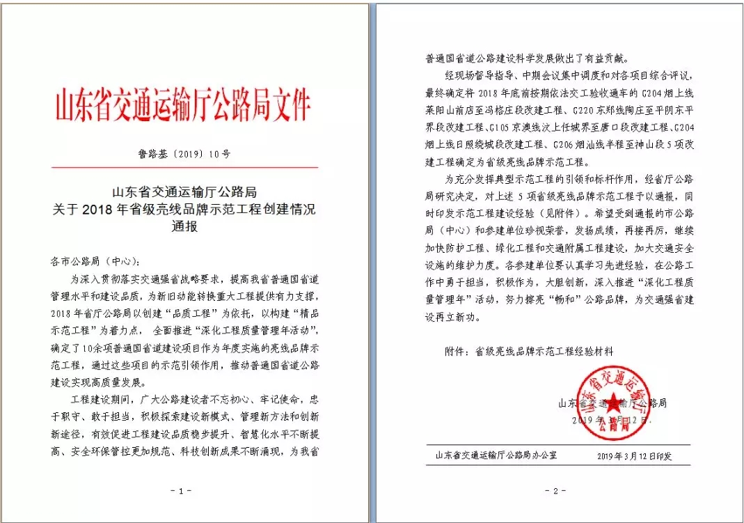由濟南城市建設集團所屬金諾公司負責代建管理、金衢公司負責設計、金曰等公司參與建設的G220東鄭線陶莊至平陰東平界段改建工程(簡稱“G220平陰南段改建工程”)喜獲山東省交通運輸廳公路局“2018年省級亮線品牌示范工程”榮譽稱號。