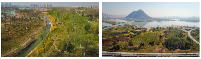 園區在設計建設時注重區分功能性和體驗性,華山北面部分定位為濕地展示區,展示濕地的景觀特性,融合體驗式科教,綠化景觀多為豐富層疊狀,各類植物栽種交錯有致,層次豐富,移步至華山東面及東南面,這片區域定位為山林文娛區,結合北臥牛山和驢山形成特色山林景觀,靠近山體部分的植物景觀結構上則多以大開大合景觀為主,大片草地開闊寬廣,風格迥異,賞玩別有趣味。