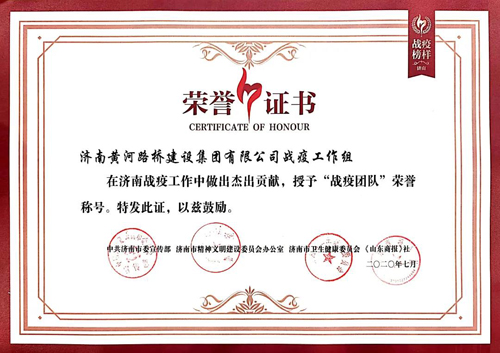 為宣傳弘揚先進典型,致敬“戰疫”英雄,激勵大家不忘初心、牢記使命,近日,中共濟南市委宣傳部、濟南市精神文明建設委員會辦公室、濟南市衛生健康委員會、《山東商報》社共同主辦的2020濟南“戰疫榜樣”活動頒獎盛典舉行。集團所屬濟南黃河路橋建設集團有限公司與金曰金宇公司聯合黨支部榮獲“戰疫團隊”稱號。