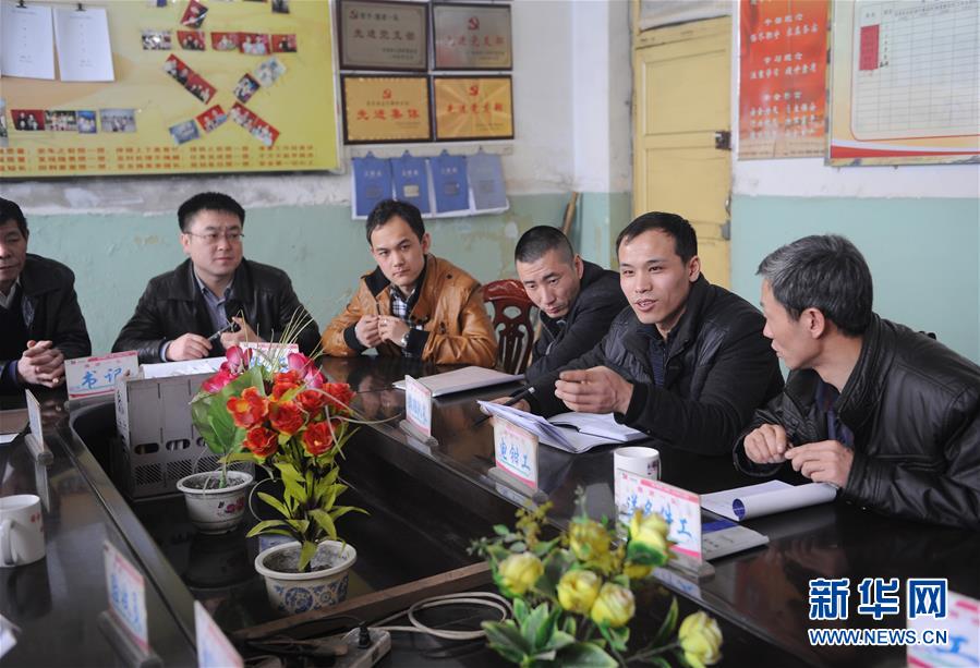 全國人大代表、山西焦煤西山煤電杜兒坪煤礦的董林(右二)在和工友們座談(2013年2月26日攝)。新華社記者燕雁攝