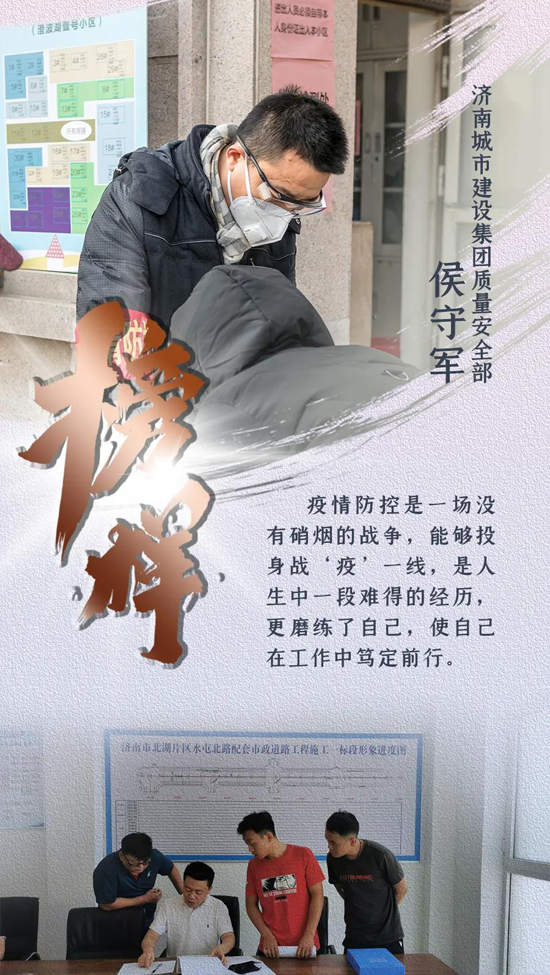 新型冠狀病毒肺炎疫情發(fā)生以來(lái),濟(jì)南城市建設(shè)集團(tuán)認(rèn)真貫徹落實(shí)中央、省、市關(guān)于疫情防控和復(fù)工復(fù)產(chǎn)的決策部署,上下一心、眾志成城,全體干部職工恪盡職守、扎根一線,全員全力投入到疫情防控阻擊戰(zhàn)中。期間,涌現(xiàn)出了眾多先進(jìn)典型和感人故事,用實(shí)際行動(dòng)詮釋了建設(shè)集團(tuán)人的精神風(fēng)貌和責(zé)任擔(dān)當(dāng)。我們?cè)诩瘓F(tuán)宣傳平臺(tái)《榜樣》欄目,推出系列人物報(bào)道,挖掘宣傳一線典型,提振士氣、凝聚力量,激勵(lì)我們繼續(xù)前行,堅(jiān)決打贏疫情防控的人民戰(zhàn)爭(zhēng)、總體戰(zhàn)、阻擊戰(zhàn)。
