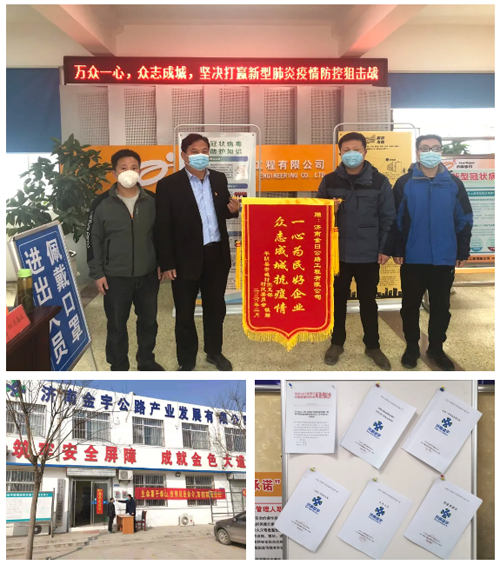 疫情來勢洶洶,在嚴峻條件下金曰公司、金宇公司等項目部主動出擊,儲備防疫物資,制作宣傳標語,協調人員調度,一手抓防疫,一手抓復工,堅持“兩手抓”,奪取“雙勝利”。金曰公司項目部為沿線的8個村莊和濟菏高速收費站捐獻了生活必需品、防疫物資,協助當地鎮政府開展疫情防控工作,積極承擔社會責任。
