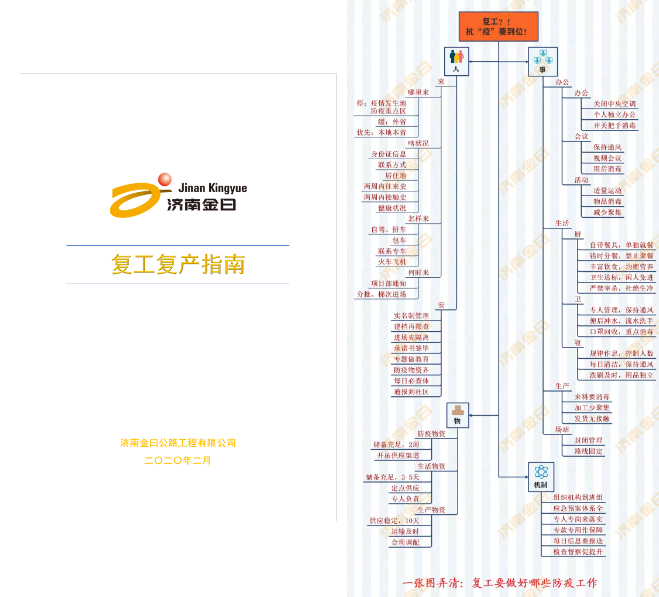 復(fù)工,要做些什么,該怎樣做?金曰公司通過一份指南明確要求,通過一張導(dǎo)圖防控部署。公司防控領(lǐng)導(dǎo)小組迅速傳達落實上級黨委工作部署,一手抓疫情防控,一手抓復(fù)工復(fù)產(chǎn),提出復(fù)工復(fù)產(chǎn)的基本要求、指導(dǎo)意見。職能部門繪制思維導(dǎo)圖,對人員如何來、怎樣保安全,做哪些準(zhǔn)備工作,體制機制的健全,辦公、生活、生產(chǎn)等防疫要點,加以明確,一目了然。