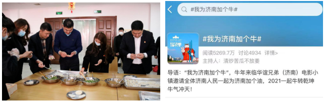 2021春節期間,華誼兄弟(濟南)電影城投資開發有限公司開展了年終總結表彰會、包餃子迎新年、我為濟南加個牛等一系列新春活動,喜迎牛年新春佳節的到來,營造了喜慶祥和的節日氛圍。