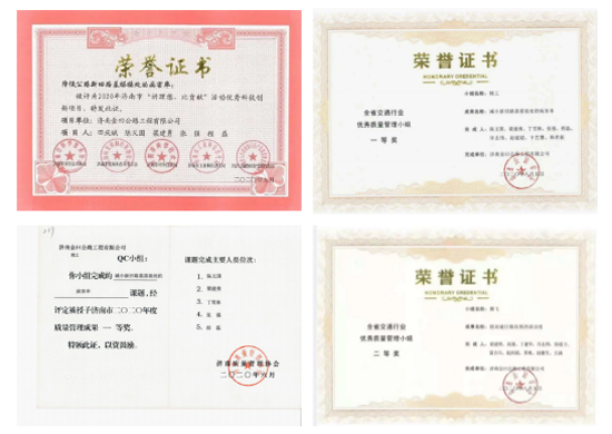項目在保證施工安全、質量、工期的同時,積極開展優化、創新活動。“精工”QC小組《減小新舊路基搭接處的病害率》課題,被濟南市質量管理協會評為2020年度一等獎,山東公路協會一等獎,并被評為2020年濟南市“講理想、比貢獻”活動優秀科技創新項目;“騰飛”QC小組《提高通行路段圍擋清潔度》課題,被濟南市質量管理協會評為2020年度二等獎。