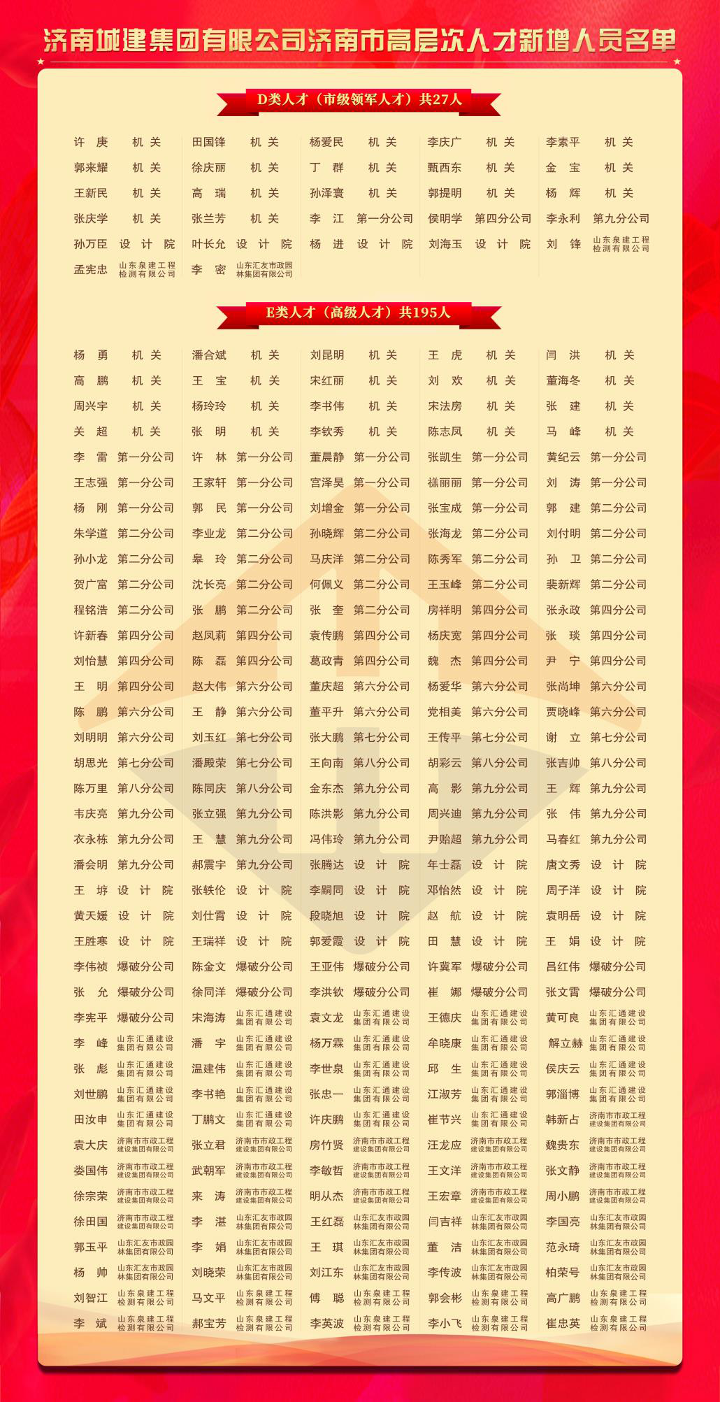 近期,濟南市高層次人才分類認定2020年第五批審核結果公布,城建集團新增市級領軍人才(D類)27人,高級人才(E類)195人。