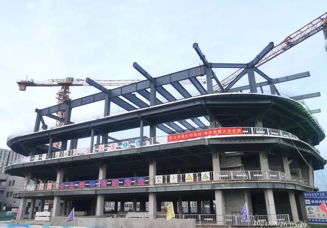 在主體結構施工中,采用鋼構框架安裝,施工采用BIM排布鋼構安裝順序,鋼構組件抵達施工現場后施工人員按照編號快速有效拼接。樓板采用樓承板安裝,在免除支模板施工同時也提高了安全性加快了施工進度,實現了安全經濟環保的綜合效益。