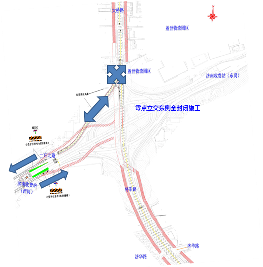 在此期間,零點立交橋下的大橋路南北向及G35濟廣高速主線東西向車輛正常通行。二環北路由西向東前往零點立交以北的左轉車輛,需通過零點立交橋西北象限擴建現狀道路與大橋路交叉口(現狀燈控口)進行交通轉換。其它車輛均需通過外圍相關道路繞行。