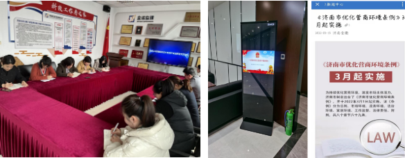 集團公司在高新辦公區及項目部開展以《濟南市優化營商環境條例》為主題的集中學習活動,進一步提高國有企業干部職工優化營商環境的意識和能力。同時,集團公司通過電子宣傳屏播放宣傳標語、發放宣傳冊等形式,引導公司員工認識優化營商環境的重要性,營造了“人人關心營商環境,人人維護營商環境”的良好氛圍,推動優化提升營商環境進一步走向深入。