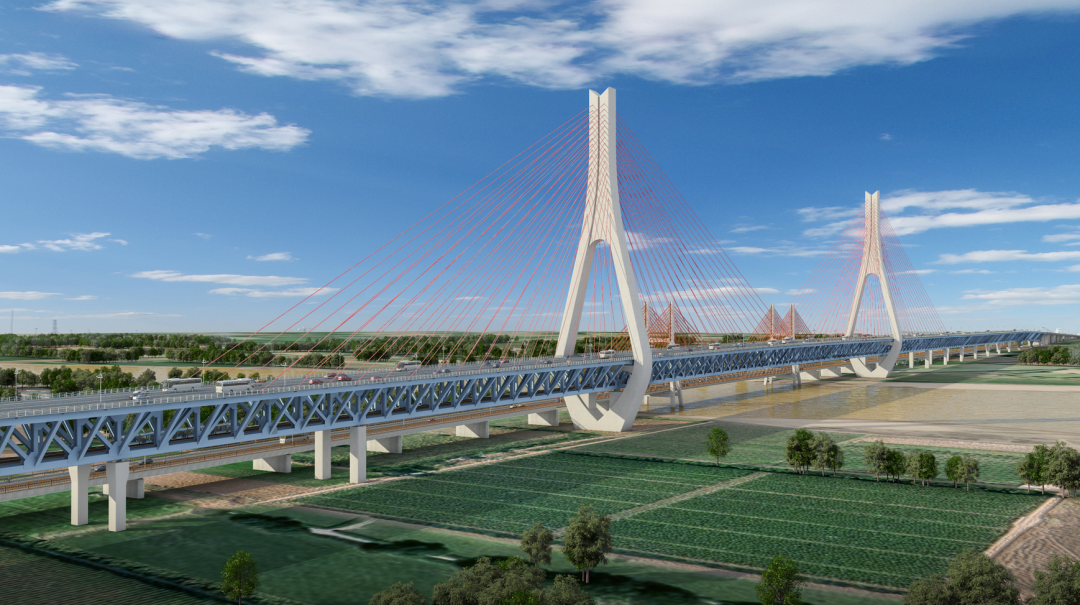 項目起點位于歷城區濟華路與二環東路平交口以南約500米,終點位于起步區大橋街道山后陳家以東與G220平交。項目全長7.748公里,其中主線橋梁長6.87公里;上下口匝道2對;互通立交2處,分別為零點立交及黃河北立交;設置養護工區1處,大橋收費站1處、匝道收費站2處,不設置服務區。主線采用一級公路兼具城市快速路標準建設,設計速度80公里/小時,采用雙向六、八車道。濟廣高速改造為雙向六車道,設計速度為120 公里/小時,具備遠期改造為雙八城市快速路的條件。黃河大橋主橋為主跨488米的雙塔雙索面鋼桁梁斜拉橋,新、老橋中心間距33.5米,組合形成世界上第一座三層橋面空間布置的斜拉橋群。黃河大橋實現了城市主干路、城市快速路、軌道交通、高速公路及國家干線公路等多功能需求,為國內首座五位一體超級綜合體工程。