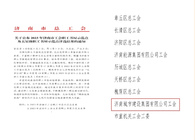 12月18日,濟(jì)南市總工會(huì)發(fā)布《關(guān)于公布2023年濟(jì)南市工會(huì)職工書屋示范點(diǎn)及五星級(jí)職工書屋示范點(diǎn)評(píng)選結(jié)果的通知》,濟(jì)南城市建設(shè)集團(tuán)有限公司職工書屋獲評(píng)2023年濟(jì)南市工會(huì)職工書屋示范點(diǎn)。