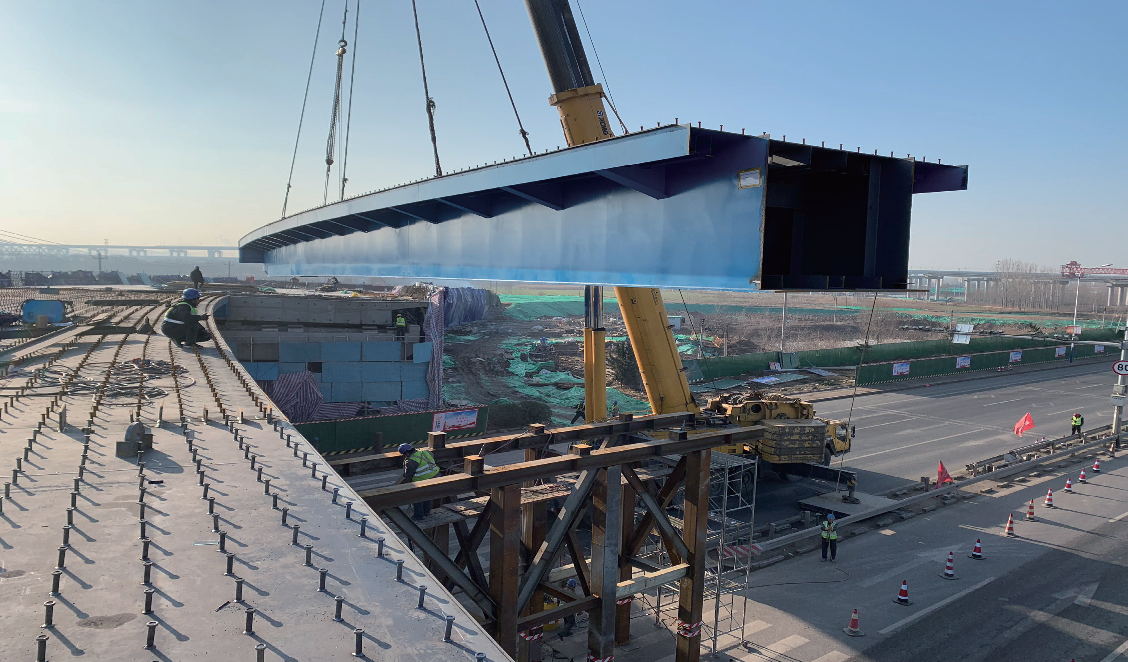 該項目“三跨青銀,兩跨濟青”,工程起點3次跨越青銀高速,工程終點2次跨越濟青高速,所有跨越都在不中斷交通的情況下進行的。在施工過程中,把重達140噸的箱梁整體跨越,對工藝、技術、安全等都有極高的要求。項目部先后組織召開四次專家論證會,對多個方案進行比選,形成最優方案,提前24天完成G220鋼箱梁吊裝施工,未出現任何安全問題。在鋼橋橋面施工中采用了澆筑式瀝青混凝土鋪裝,有效延長了橋梁主體和路面的使用壽命,降低了養護、維修和管理費用。道路伸縮縫口設計成S波浪型,有效吸收車輛輪胎的沖擊動能,降低噪聲,提高行車舒適度。
