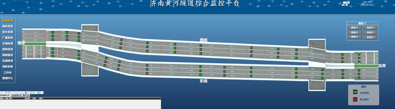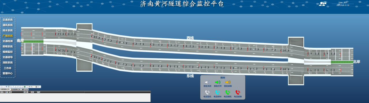 在濟南黃河濟濼路隧道中,交通系統的主要設備包括72個道路指示燈、7塊情報板和12組車感線圈,設備的應用可以有效地誘導車輛按照規定的路線和速度行駛,保證交通流暢和安全,進一步提高交通運營效率;