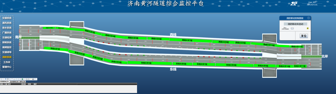 隧道消防系統擁有147套泡沫噴霧、136個雙波長火焰探測器、87個消火栓箱、288個滅火器箱、2條感溫光纖和6臺功率110kw風量36萬m³/h排煙風機,設備的應用可以在火災初期及時發現并處理火災,保障隧道內人員和設施的安全;