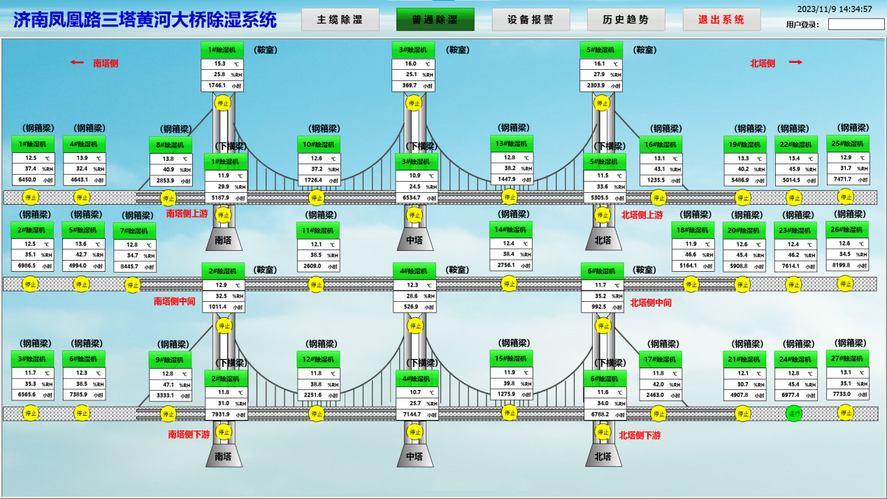 為保持橋梁結構強度,防止鋼箱梁、內部鋼架、主纜銹蝕,延長橋梁使用壽命,大橋安裝有3套主纜除濕系統、6套鞍室除濕系統、6套主塔除濕系統、27套鋼箱梁除濕機。所有除濕機都使用網格連接,通過邏輯控制系統實現數據共享、自動化除濕等任務,時刻消除設備頑疾病害,提高行車安全系數。