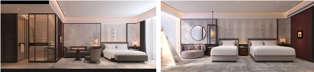 客房區域的設計以“畫屏”借助宋代屏風的藝術形態,通過提取、拆解、重構,以中國傳統繪畫留白的手法契合現代年輕人的審美。