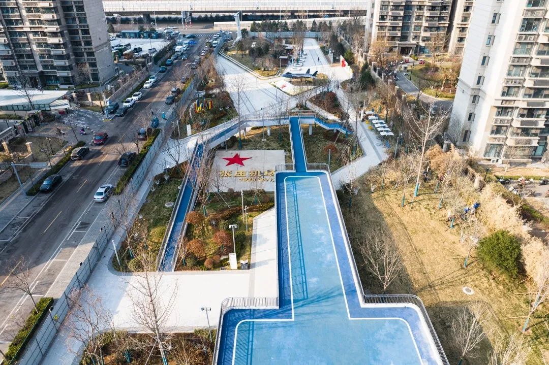 公園南區(qū)入口打造文化長廊,通過展示中國戰(zhàn)機發(fā)展史讓市民了解空軍文化;結(jié)合原有170米長水泥跑道,通過景觀手法進行二次設(shè)計,融合機場跑道符號、導(dǎo)航等設(shè)施還原機場跑道場景,沿跑道科普展示曾在張莊機場服役的戰(zhàn)機模型,進行航空科普、國防軍事及愛國主義教育。