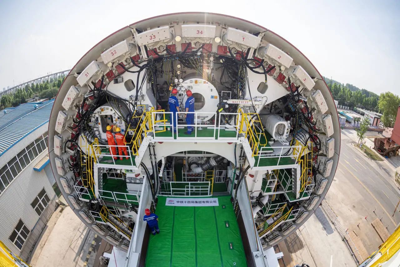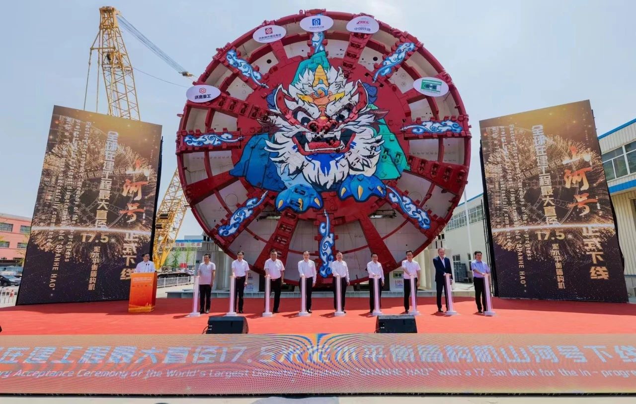 “山河號”泥水平衡盾構機由濟南重工集團、海瑞克集團聯合濟南城市建設集團、中鐵十四局集團研發制造,最大開挖直徑17.5米,盾構機總長163米、重約5200噸、裝機總功率12580千瓦;配備各類型開挖刀具共計306把,其中57把具備滾齒互換功能,以優化其在多變地層中的作業性能;裝配帶壓復合型刀盤、伸縮式主驅動、泥水倉伸縮攝像頭;搭載刀盤磨損自動監測、設備狀態在線監測和“五官一腦”智能化裝備系統,并通過大盾構云智慧平臺實現遠程操控,以保證掘進安全和效率。