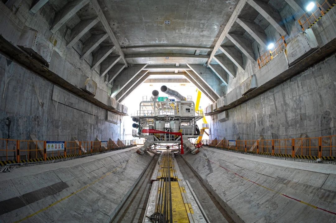 負責盾構施工的“山河號”泥水平衡盾構機,最大開挖直徑達17.5米,相當于6層樓的高度,盾構機總長163米、重5200噸、裝機總功率12580千瓦。