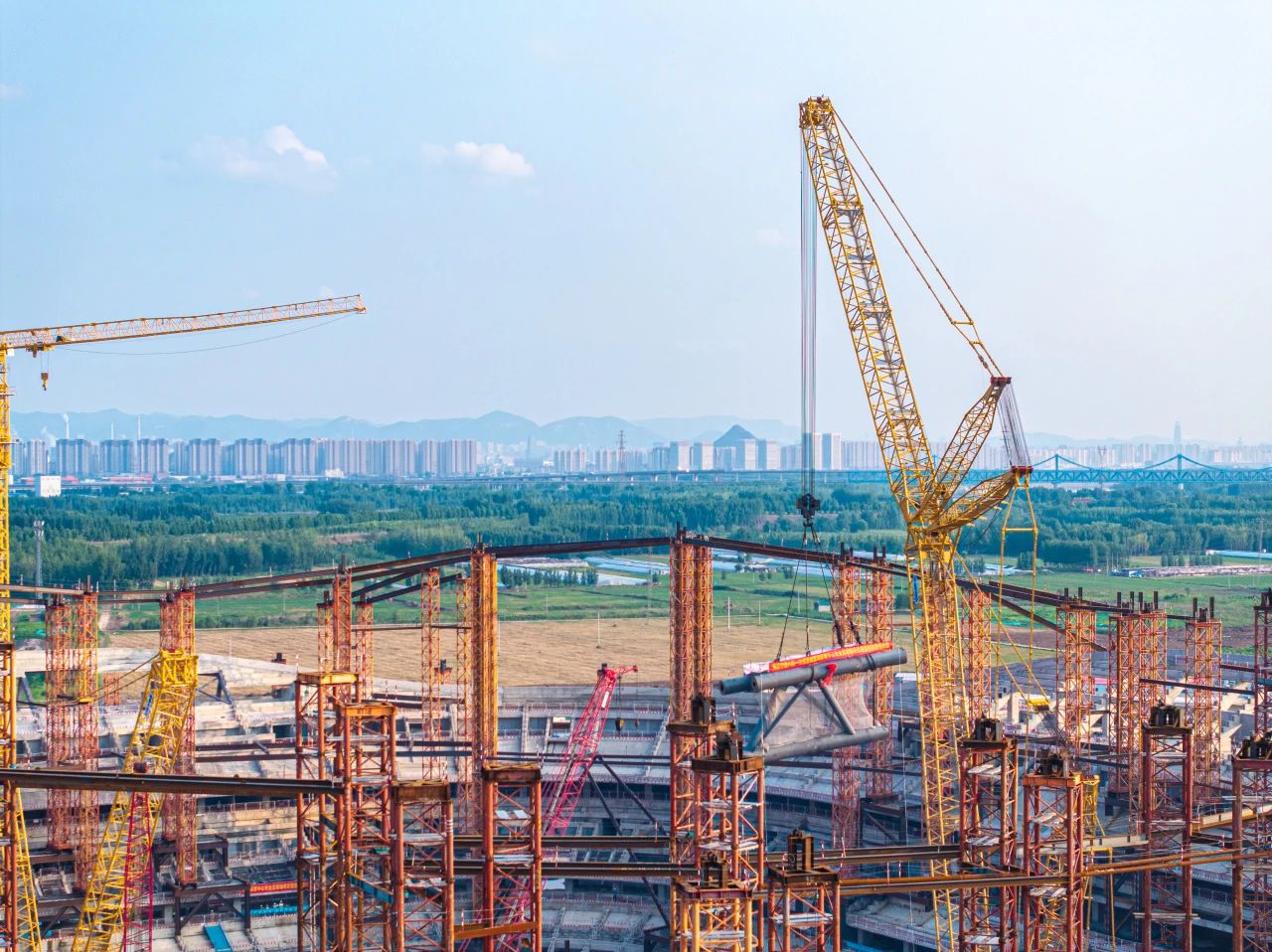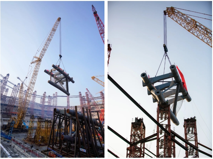 本次實(shí)施的首次吊裝段,位于內(nèi)環(huán)桁架,單元吊重達(dá)168噸,起吊縱深高達(dá)60余米。項(xiàng)目位于濟(jì)南新舊動能轉(zhuǎn)換起步區(qū),建筑面積19.73萬平方米,建筑高度為60米,是山東省首個(gè)6萬座專業(yè)足球場,可承辦國際、國內(nèi)重大體育賽事。同時(shí)也是國內(nèi)體育場館懸挑長度最大的工程,最大懸挑長度達(dá)到了45米,屋蓋鋼結(jié)構(gòu)由星形拱桁架、內(nèi)環(huán)桁架、外環(huán)桁架、單層網(wǎng)格及挑檐組成,總鋼量約3.1萬噸,靠36根排架柱支撐,形成巨型無柱大懸挑空間,在整體結(jié)構(gòu)中起到了承上啟下作用,下方排架柱與混凝土結(jié)構(gòu)相連,上方支撐索結(jié)構(gòu)、膜結(jié)構(gòu)。項(xiàng)目預(yù)計(jì)在2026年底竣工驗(yàn)收完成。