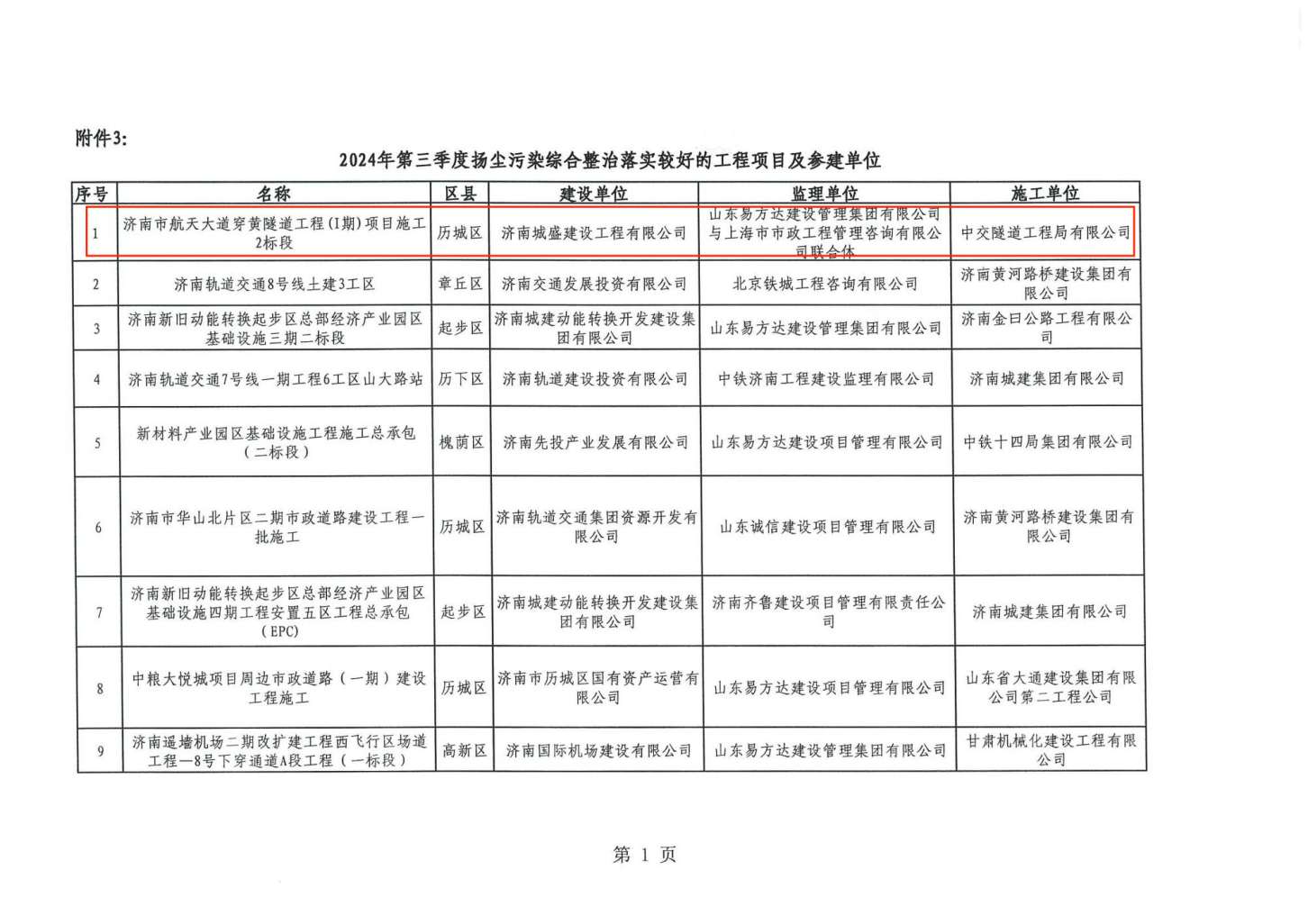 近日,濟南市城鄉(xiāng)交通運輸局公布了2024年第三季度交通建設工程揚塵治理通報,建設集團投資建設的濟南市航天大道穿黃隧道工程(I期)項目施工2標段脫穎而出,被予以通報表揚,該標段由中交隧道工程局有限公司承建。