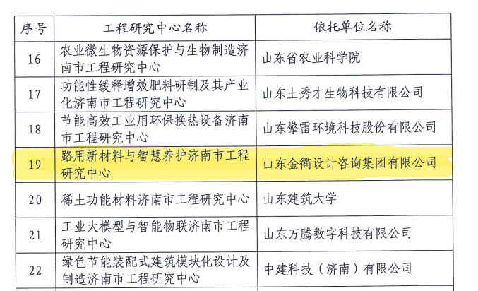 近日,濟南市發展和改革委員會下發《關于公布2024年度認定濟南市工程研究中心名單的通知》,建設集團所屬山東金衢設計集團有限公司“路用新材料與智慧養護濟南市工程研究中心”(以下簡稱工程研究中心)經嚴格考察、評審和公示,成功入選,這是2024年金衢集團公司繼濟南市重點實驗室、專家工作站、服務業創新中心后獲批的又一科創平臺。