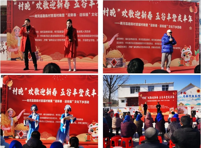 由濟南廣播電視臺文旅體育頻道、濟南市呂劇院、濟南職業(yè)學(xué)院、濟南江湖藝社等志愿者聯(lián)合村民共同組織的“村晚”歡歌迎新春 五谷豐登慶豐年——商河縣路陳村首屆村晚暨“迎新春·送祝福”文化演出活動在村委會廣場舉行,演出節(jié)目豐富多彩,既有傳統(tǒng)的戲曲、曲藝表演,也有現(xiàn)代的歌舞節(jié)目,充分展現(xiàn)了鄉(xiāng)村文化的獨特魅力。