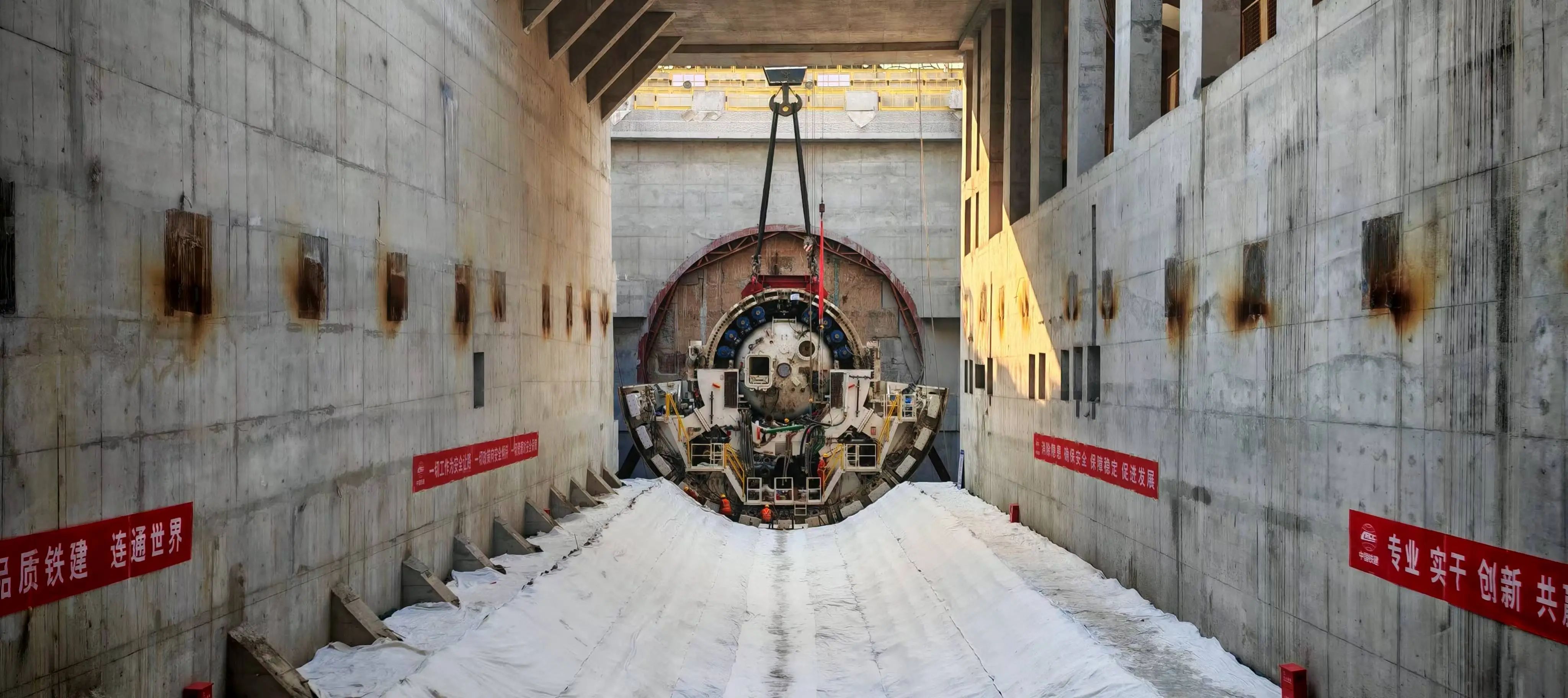 濟南市航天大道穿黃隧道(I期)全長約3.89公里,新建隧道約3.73公里,其中盾構段約3.25公里,采用雙管單層盾構形式,管片外徑14.5米,雙向六車道設計。目前,東岸圍護結構、土方開挖和主體結構施工完成,2月18日完成“啟航號”盾構機主驅動下井,盾構機總體組裝進度過半,配套設備組裝完成60%,進入了入地組裝的關鍵階段,接下來還將進行盾構機的刀盤下井吊裝工作,并全面開展盾構機始發前的整體安裝調試;南線盾構隧道始發基座、反力架基座施工,敞開段重載便道、接線道路復合地基加固和管線工程同步進行中;西岸圍護結構已完成,正在進行接收井基坑土方開挖及基坑砼支撐施工。